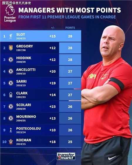 加入安菲尔德的新帅斯洛特,在一系列的努力后终于是证明了自己,他不仅打出了很是奇迹般的梦幻的开端,接下来的遇强则强则让他名气大增,对他信服的人也是越来越多的。根据德国转会市场统计,教练英超生涯前11场比赛的积分,斯洛特28分并列居首的,这个成就可是太出色了。