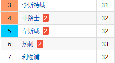 萊切斯特是高出第5名的西漢姆聯4分之多的