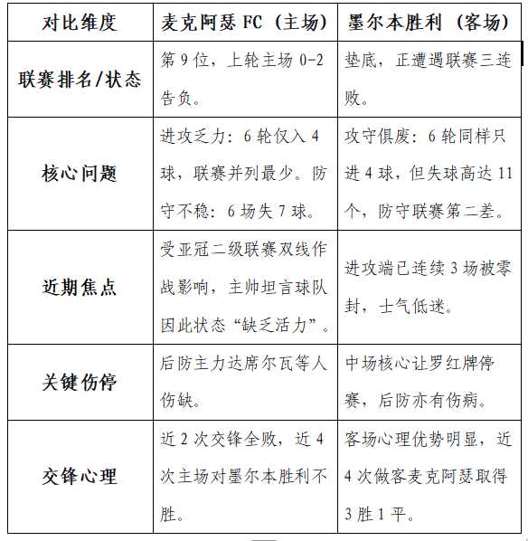今天下午麦克阿瑟FC与墨尔本胜利的这场澳超比赛,看似是两支排名下游球队的“菜鸡互啄”,但我认为核心看点在于:两支拥有“联赛最差进攻线”的球队,在历史交锋中却总能上演进球大战,这种巨大的矛盾将如何被现实状态所调和。